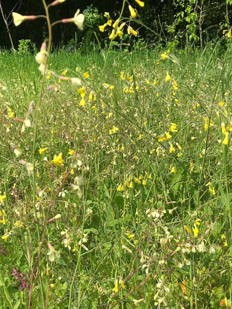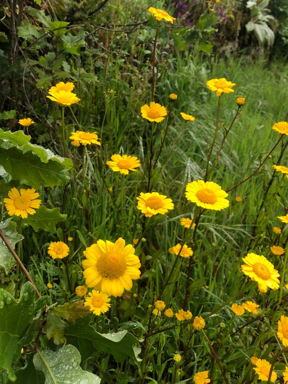 We knew we’d enjoy watching the seasons change here, but the speed with which the natural environment explodes with new life, recolours our surroundings and then proceeds to new forms is quite remarkable. After one week away in Spain, we’ve returned to meadows abundant with purple viper’s bugloss, replacing the more delicate blue violets, and the pretty white meadow saxifrage has been hustled behind tall grass and the wonderfully-named crested wartycabbage flowers. Golden Mediterranean marigolds light up Monty’s route to the dark, tunnelling paths that edge down past a vineyard to the woody glade where the Spanish bluebells have cast off their bells, and the ground waits for whatever’s next.