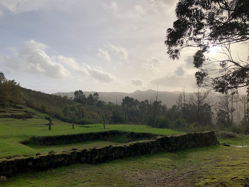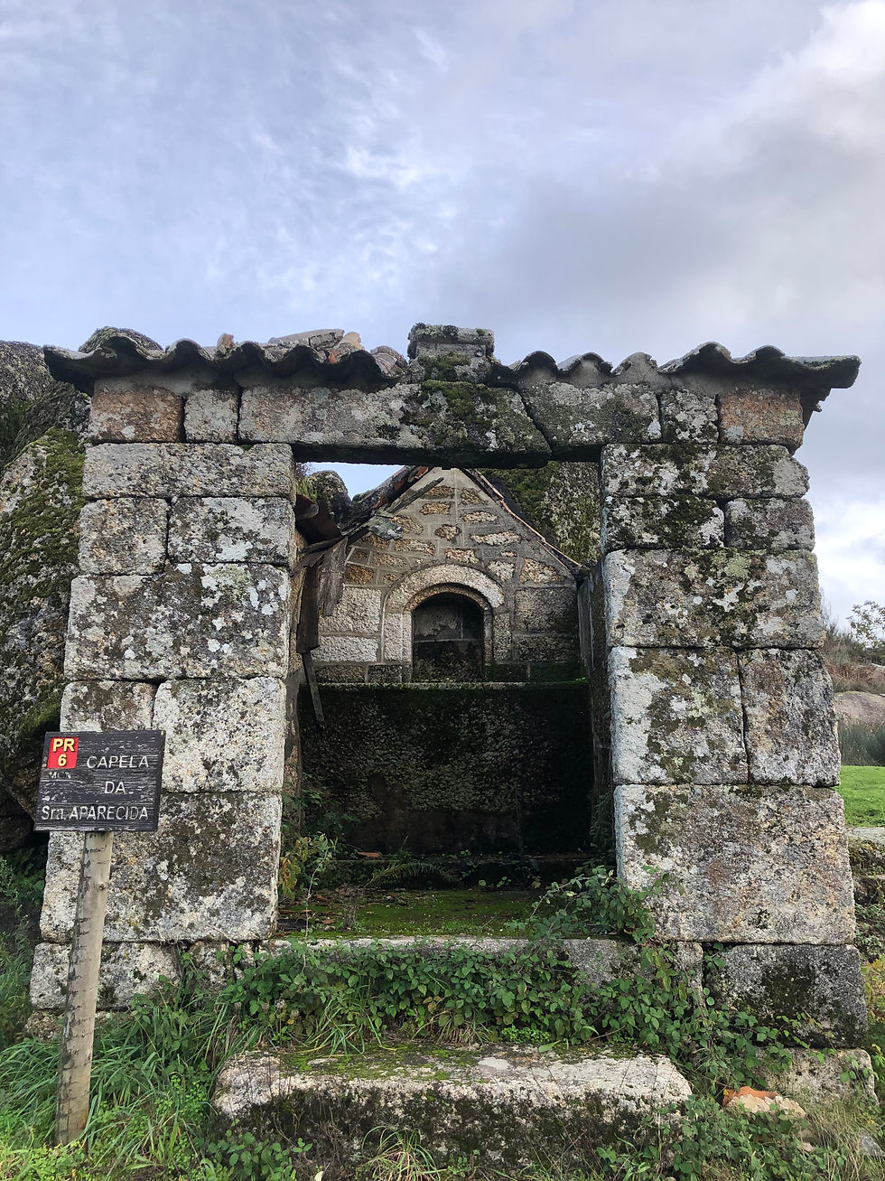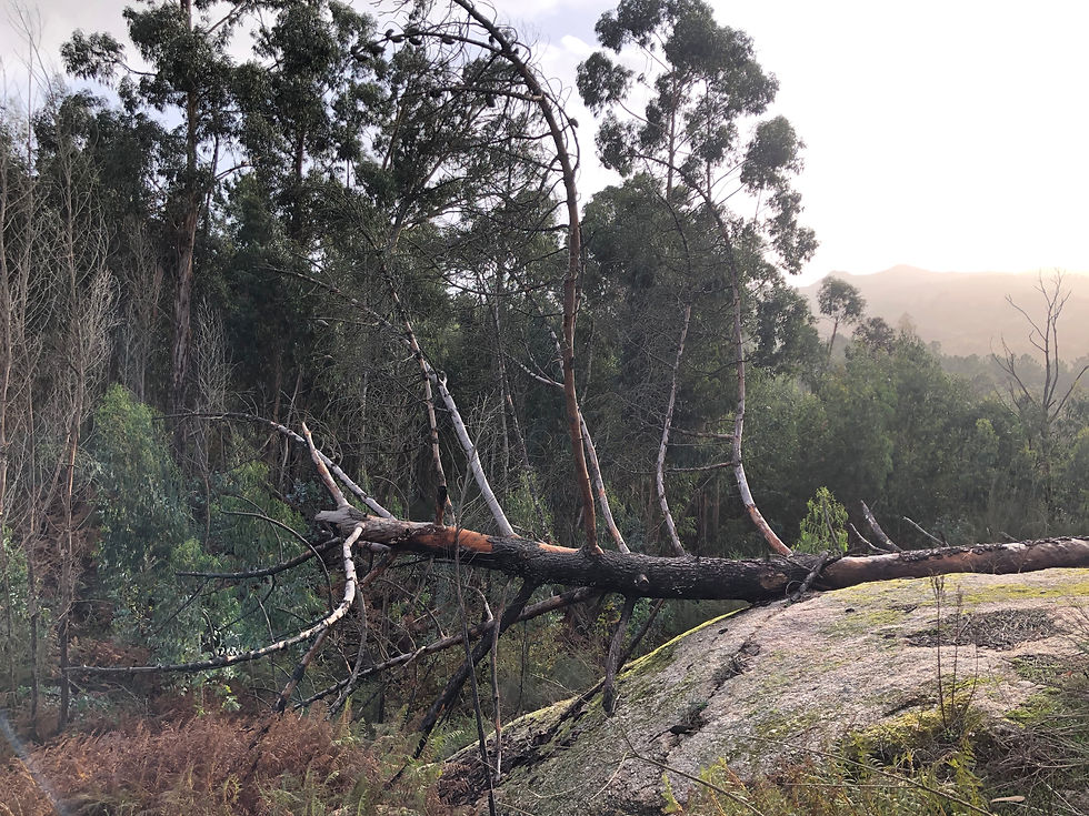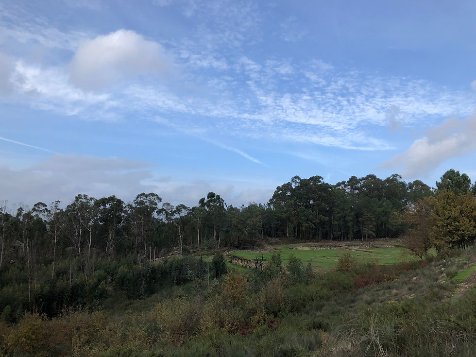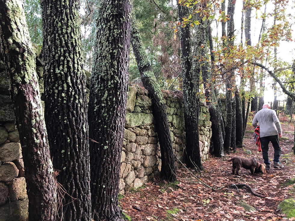 Just a ten-minute drive away, there’s a Roman site (Tongobriga) that the rainless day enticed us to. You’ve always got to innovate when you have a dog so going into the site to see the forum and baths was not an option, but instead we explored the little village, followed paths that led to and through the necropolis and the remains of Roman habitations, now filled with mossy puddles and providing Monty with the oldest paddling pools he’s yet enjoyed. A marked walking trail – the PR6 – skirts around the site’s perimeter, leading us to a derelict chapel and granite outcrops where fire-blackened eucalyptuses bravely seemed to be in the process of regenerating themselves. One sad specimen lay toppled, though, brought down by the recent rains. I always enjoy surveying ancient sites. I like to stand on a high piece of land and take it all in, more so than scrutinising detail. No doubt that’s because I can only really bring an appreciation of its aesthetics, having very little knowledge of the history beyond school books. And so as we stood at the far end of the fenced-in forum, and watched a wintry haze soften the mountains on the horizon, I offered a silent thank you for yet another ‘exception’ that our time here in Portugal never seems to fail to offer up.